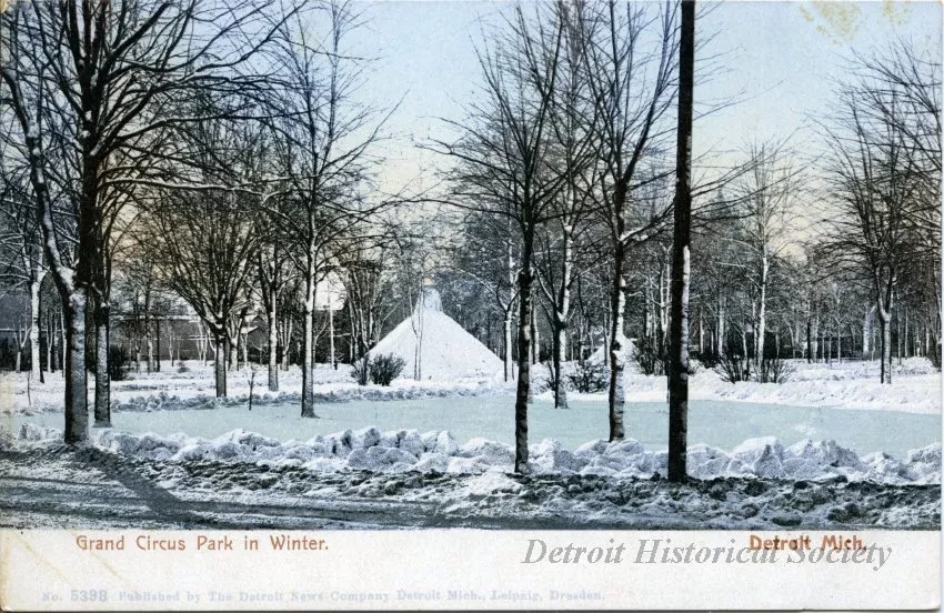 Request ImageColor postcard depicting a scene in Grand Circus Park with the ground covered with snow and the trees bare.