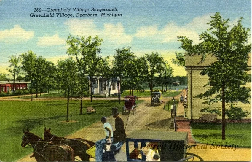 Printed on verso: Greenfield Village Stage-Coach, Dearborn, Mich. As there are no automobiles allowed in this historical village, a waiting carriage greets the visitor to carry him to the many points of interest.