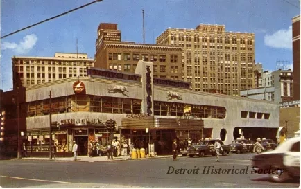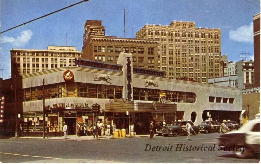 Color photographic postcard depicting the Greyhound Bus Terminal on the northwest corner of Grand River Avenue and Washington Boulevard, with cars and pedestrians in front. In view are Cunningham's drug store, and in the background the United Artists Theatre Building, Michigan Building, and a sign reading "Michigan Consolidated Gas Company".
