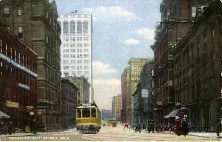 Color postcard depicting Griswold Street, facing north from W Jefferson Avenue. In the foreground is a streetcar labeled "Grosse Pointe". In view are the Norton Hotel, Campau Block, Ford Building, and Newberry & McMillan Building.