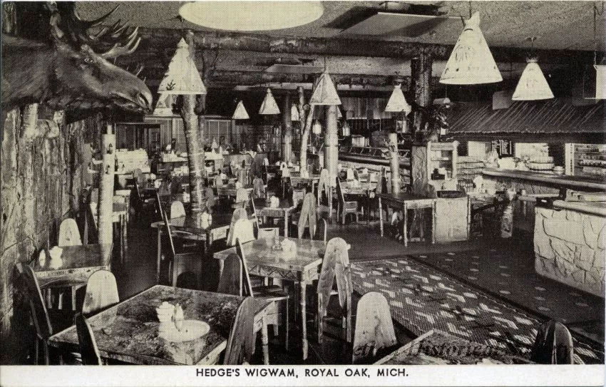 Printed on verso: Hedge's Wigwam; Woodward Ave. at 10 Mile Rd.; Royal Oak, Mich. A portion of the air-conditioned cafeteria dining room decorated in white birch and stone.