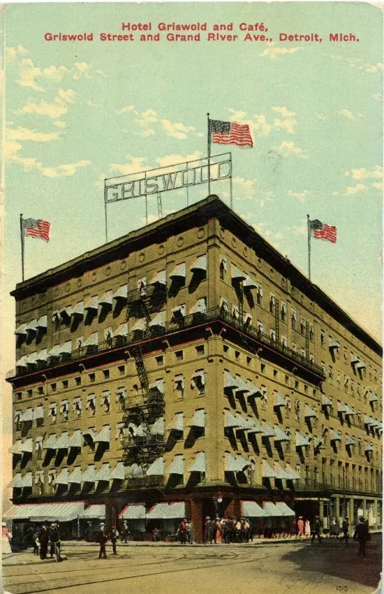 Printed on verso: Hotel Griswold and Café. Is situated on the busy corner of Griswold Street and Grand River Avenue, and although one of the oldest, is most popular, being refitted and having one of the finest cafes between New York and Chicago. Here can be heard the finest music both vocal and instrumental with cuisine unsurpassed.