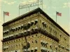 Color Postcard depicting the Griswold Hotel from the corner of Griswold Street and Grand River Avenue, with several pedestrians in front and three American flags flying from the roof.