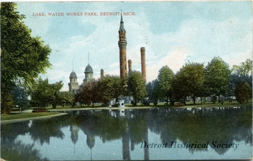 Color postcard depicting Water Works Park, with the tower, pumping station, and drinking fountain in view and water in the foreground.