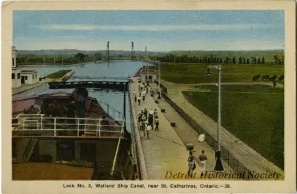 One postcard entitled "Lock No. 3, Welland Ship Canal, near St. Catharines, Ontario." The postcard shows a color bird's-eye view image of Lock No.3 in the Welland Ship Canal. Part of a ship is shown within the lock on the left, and people are on the walkway on the right.