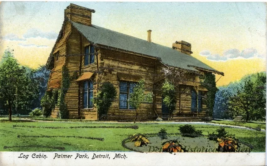 Request ImageColor postcard accented with silver glitter depicting the Log Cabin in Palmer Park, with a flowerbed in the foreground.