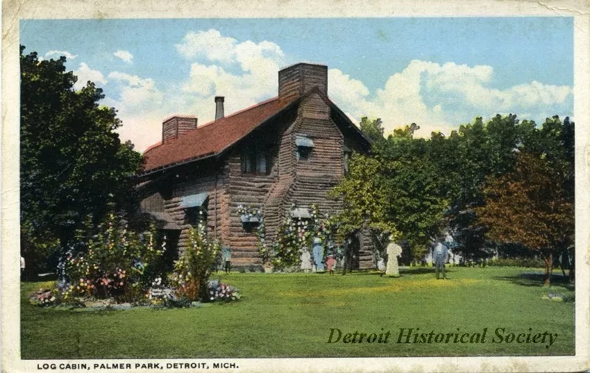Printed on verso: Log Cabin, Palmer Park, Detroit, Mich. Log Cabin, Palmer Park. - Built on land donated to the city by Ex-Senator Thomas W. Palmer in 1893, and is situated north of the city at the extreme terminal of the Woodward Avenue car line, is one of the city's favorite breathing spots. Its center piece is a log cabin which is an exact reproduction of the home in which Senator Palmer resided when Detroit was little more than a trading post.