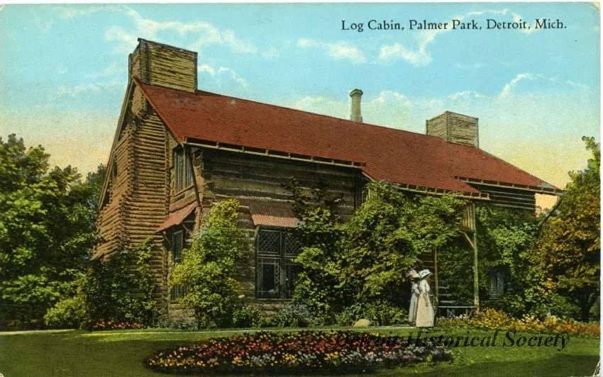 Printed on verso: Log Cabin, Palmer Park, Detroit, Mich. Log Cabin is located at Palmer Park, one of Detroit's Prettiest resting spots, containing 120 acres. The Log Cabin is an exact reproduction of the home in which Senator Palmer resided many years ago. One of the features of the Log Cabin is its quaint old furniture.