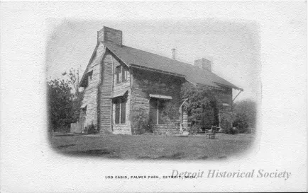 Request ImageBlack and white postcard depicting the Log Cabin in Palmer Park, with a chair in front and a white margin around the image.