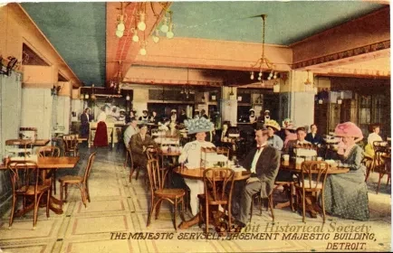 Printed on verso: The Majestic Servself, Detroit's ideally located quick lunch, is the largest, finest and most complete of its kind in America, having a serving capacity of over 1,000 persons an hour. Tempting well-cooked dishes are displayed on large serving counters from which customers select their food. Home cooking, ideal surroundings and the very best of service has made it Detroit's most popular quick lunch. This restaurant appeals particularly to visitors and tourists, street cars from every station and steamboat dock stopping directly in front of the building. The Majestic is only one of the many high-class restaurants operated by Messrs. Brennan, Fitzgerald & Sinks.