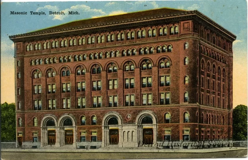 Color postcard depicting a rendering of a proposed, but never completed, addition and expansion to the Masonic Temple on the corner of W Lafayette Boulevard and 1st Street.