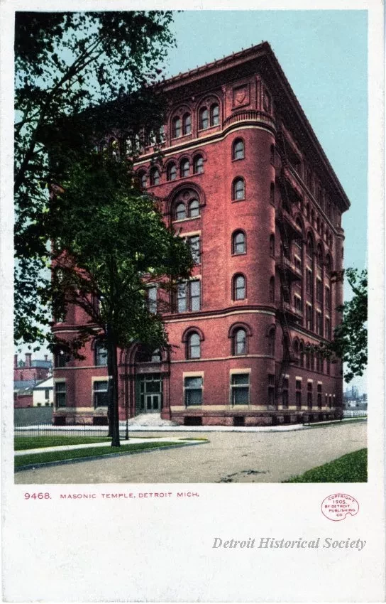 Postcard. Illustrated color print of the Masonic Temple in Detroit. The postcard features the Lafayette Boulevard Temple, a seven story tall red brick building, located at Lafayette Boulevard and First Street. Depicts the original building and location of the Detroit Masonic Temple. Features trees with leaves. Copyright 1904 by the Rotograph Company.