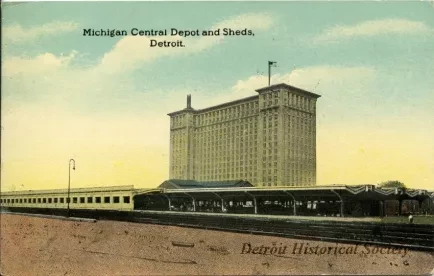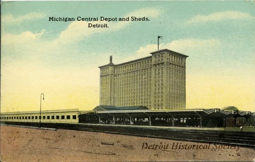 Color postcard depicting the back of Michigan Central Station, with train sheds and railroad tracks in the foreground.