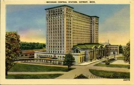 Printed on verso: Michigan Central Station is located near Michigan Avenue between Fifteenth and Seventeenth Streets, covers twenty-one acres and the total cost is $15,000,000.00. There will be eleven tracks in the station that will accommodate 135 passenger coaches. It has all conveniences such as a complete Drug Store with special facilities for the care of Invalids and Change Room where travelers can at nominal cost obtain Shower Baths and make a change of clothing. Accommodations for passengers will not be outdone by any Railroad Station in the World.