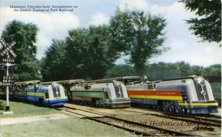 Printed on verso: Miniature Streamliners. Chrysler Corporation designed and built these three new miniature streamlined engines and donated them to the Detroit News Zoological Park Railroad in memory of the company's founder, Walter P. Chrysler, and of two distinguished Detroit civic leaders, William E. Scripps and Walter O. Briggs. Some 1,000,000 people use this railroad in a year.