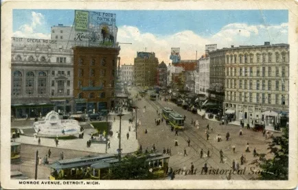 Printed on verso: Monroe Avenue, Detroit, Mich. Monroe Avenue is Detroit's Great Amusement thoroughfare. Here are located the Temple, Family, Columbia Royale and National Theatres, also any number of Nickel Shows. The electric display at night is very brilliant and here we follow the crowd in the evening.