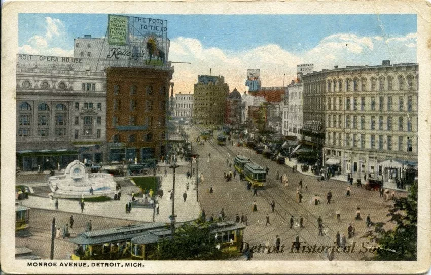 Color postcard depicting an elevated view of Monroe Street at Campus Martius, facing northeast. In view are many pedestrians, Merrill Fountain, Detroit Opera House, and signs reading "Kellogg's Toasted Corn Flakes, The Food To Tie To" and "Chop Suey".