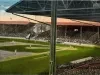 Color postcard depicting the inside of Navin Field from the stands along the third base line, with baseball players on the field.