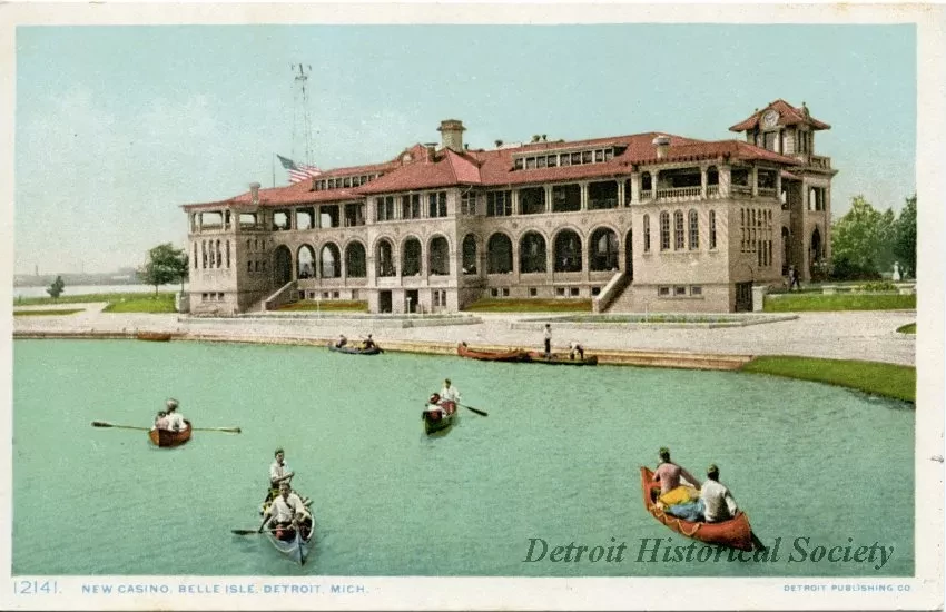 Color postcard depicting the Casino on Belle Isle, with Lake Tacoma in the foreground. People are visible in canoes and near the water's edge. In the background is a tower.