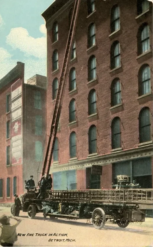 Color postcard depicting an aerial ladder truck in front of a 6 story building, with the ladder extended to the roof.