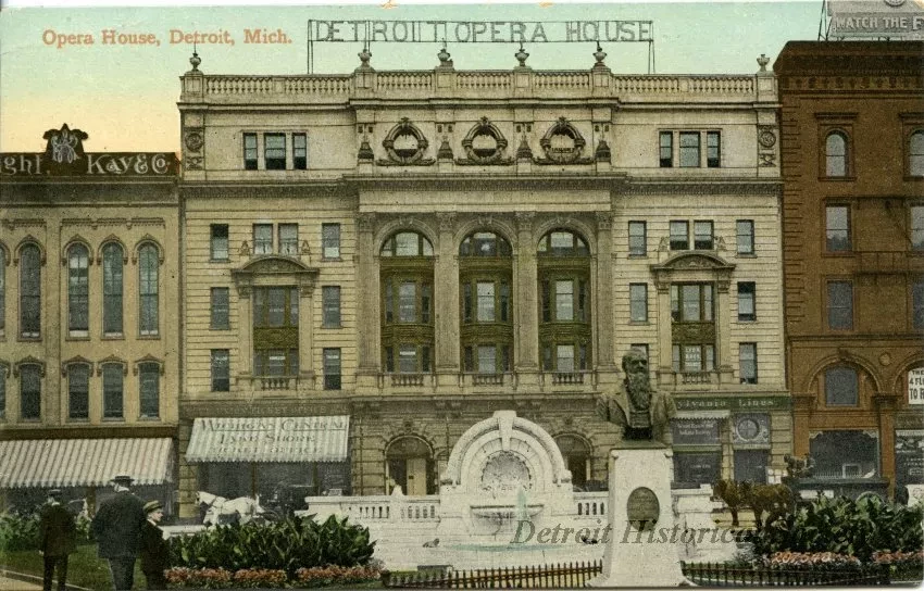 Color postcard depicting the Detroit Opera House at Campus Martius, with the Merrill Fountain and bust of John J. Bagley in the foreground. Signs read "Michigan Central Lake Shore Ticket Office", "Union Ticket Office", and "Wright, Kay & Co."
