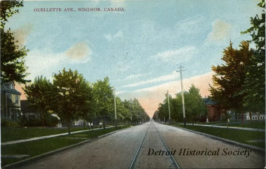 Color postcard depicting a view along Ouellette Avenue in Windsor, ON. Houses and trees line the street.
