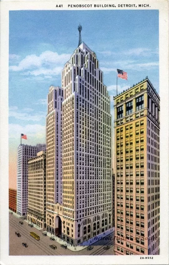 Color postcard depicting the Greater Penobscot Building from the corner of Griswold and W Fort Streets, with the Buhl, Ford, and Dime Buildings in view. Cars, pedestrians and a streetcar populate the street.