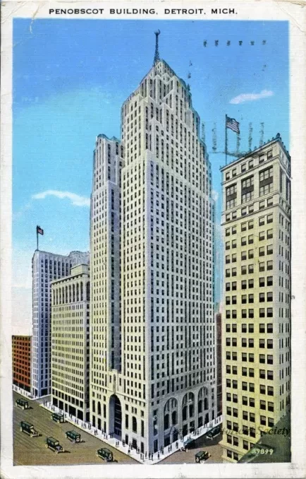 Color postcard depicting the Greater Penobscot Building from the corner of Griswold and W Fort Streets, with the Buhl, Ford, and Dime Buildings in view. Cars and pedestrians populate the street.