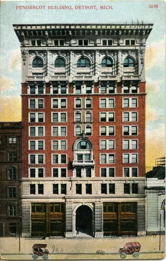 Color postcard depicting the Penobscot Building on W Fort Street, with automobiles in front and the State Savings Bank to the right.