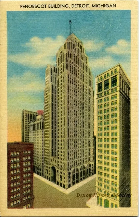 Printed on verso: Penobscot Building, Detroit, Michigan; the Penobscot Building located on Griswold Street is Detroit's tallest skyscraper. The air plane beacon on top of the building which flashes on and off continuously can be seen for many miles away against the sky line.