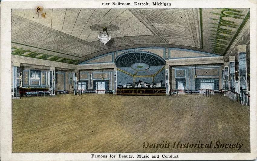 Request ImageColor postcard depicting the interior of the Pier Ballroom at Electric Park, with a stage in the background and an empty dance floor.