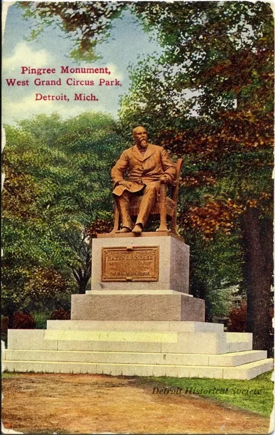 Printed on verso: The Pingree Monument in West Grand Circus Park, was erected in 1904 by popular subscription. The late Hazen S. Pingree was four times Mayor of Detroit, and twice Governor of Michigan. He died June 18th, 1901, aged 60 years.