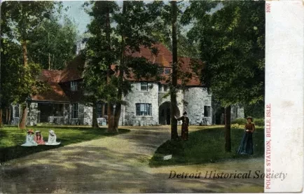 Color postcard depicting the Belle Isle Police Station, with several women in front.