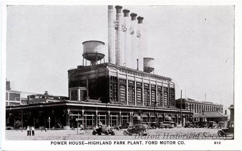 Black and white photographic postcard depicting the power house at the Ford Plant in Highland Park. Five smoke stocks have a "FORD" sign across them, and two water towers are in the background. In the foreground are automobiles and people.