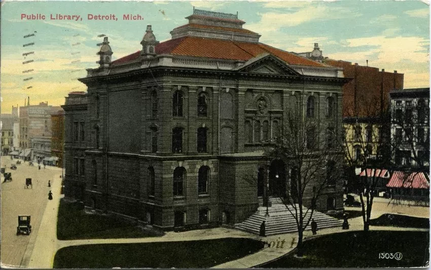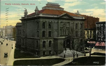 Printed on verso: The Detroit Public Library. Situated at Gratiot Avenue and Farmer Street, was built in 1875 and contains 200,000 volumes. It is conducted by a board, appointed by the Board of Education.