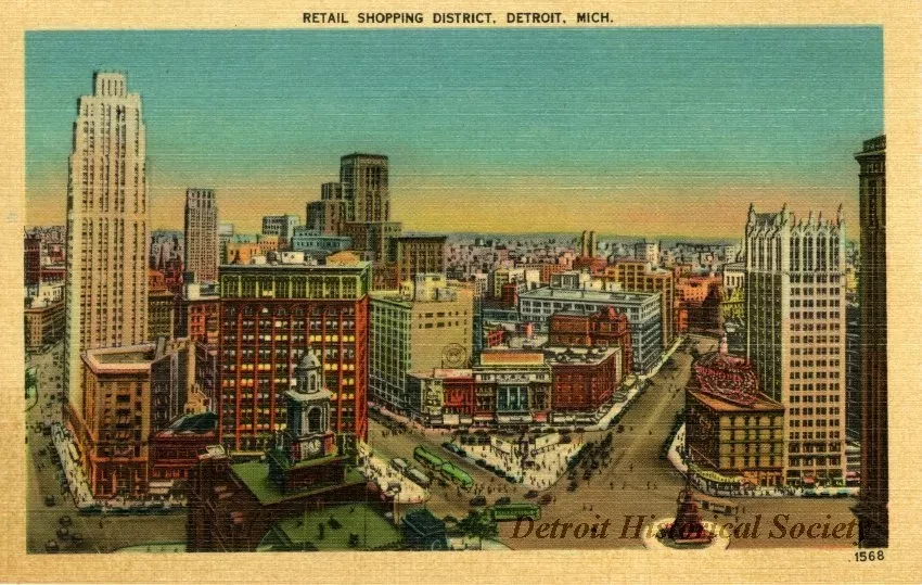 Postcard. Color postcard with textured surface entitled "Retail Shopping District, Detroit, Mich." The elevated view shows Campus Martius and Woodward Avenue, adjacent buildings, streetcars, pedestrians, and cars. The Soldiers and Sailors Monument is visible in the lower right foreground and the top of the Hudson's Building can be seen in the background. The estimated date of the postcard is based upon the image depicted and is not based upon when the postcard was printed.