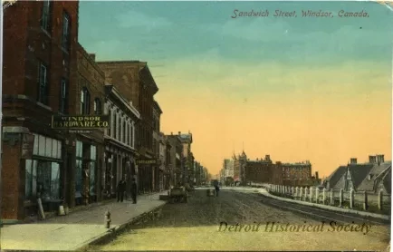 Color postcard depicting a view along Sandwich Street in Windsor, ON. To the left is the Windsor Hardware Co.
