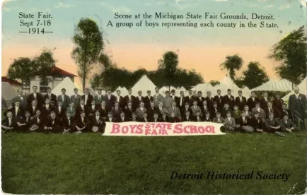 Scene at the Michigan State Fair Grounds, Detroit. A group of boys representing each county in the State. State Fair. Sept 7-18 -1914-