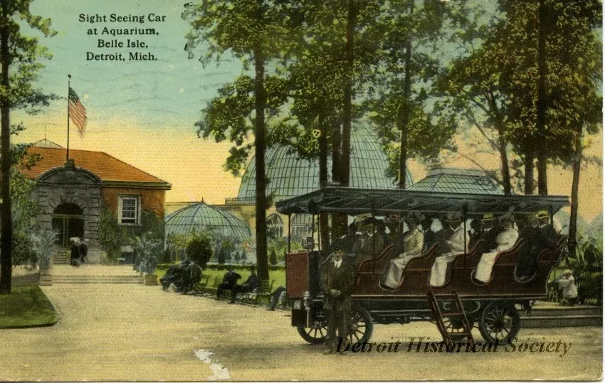 Printed on verso: Sight Seeing Car at Aquarium, Belle Isle, Detroit, Mich. Immense Sigh Seeing Cars stop at all place of Interest. The card shows one of these cars stopping at Aquarium to give passengers a chance to see this interesting sight. The Aquarium on Belle Isle is one of the finest in the country.