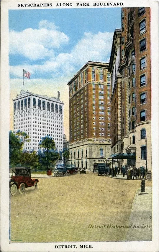 Color postcard depicting a view of buildings along Park Avenue at Grand Circus Park, with many cars and pedestrians on the street. These are the Hotel Tuller, Statler Hotel, and David Whitney Building.