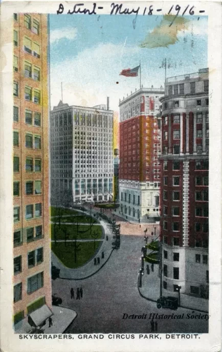 Color postcard depicting an elevated view of Grand Circus Park from the corner of Park Avenue and W Adams Street, with many cars and pedestrians. Buildings include the Hotel Tuller, Statler Hotel, David Whitney Building, and S. S. Kresge Building.