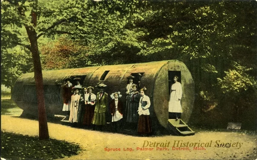 Printed on verso: Palmer Park. Built on land donated to the City by Ex-Senator Thomas W. Palmer, in 1893, and is situated north of the city at the extreme terminal of the Woodward Ave. car line; is one of the city's favorite breathing spots. Its center is a log cabin, which is an exact reproduction of the home in which Senator Palmer resided when Detroit was little more than a trading post.