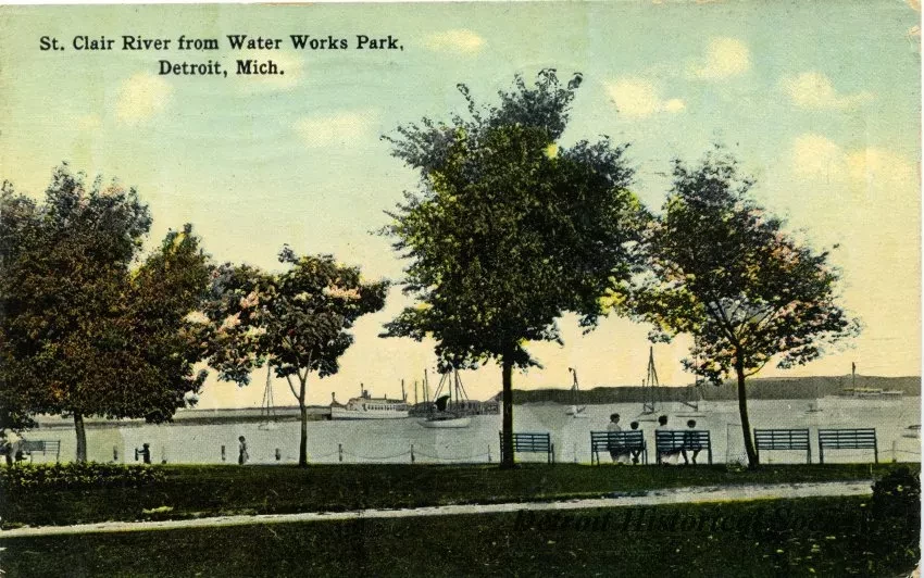 Color postcard depicting people seated on benches in Water Works Park, with ships and sailboats in the background on the Detroit River.