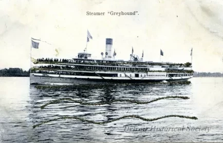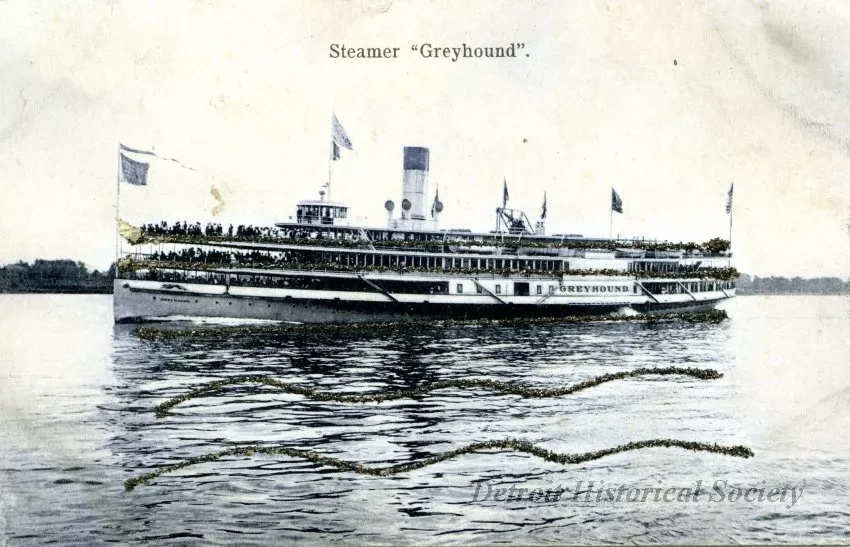 One postcard of the excursion steamship, SS GREYHOUND, of the White Star Line. A slightly blue tinted photographic image shows a port side view of the sidewheel steamship which is underway in fair weather on a river or lake. A shoreline is visible in the background. The image has been enhanced with glitter lines on the ship decks and on the water surface. Small gray printed text at the upper center edge reads "Steamer "Greyhound." Small printed text on the verso reads "Kresge & Wilson, Detroit, Mich.," and "Printed in Germany."