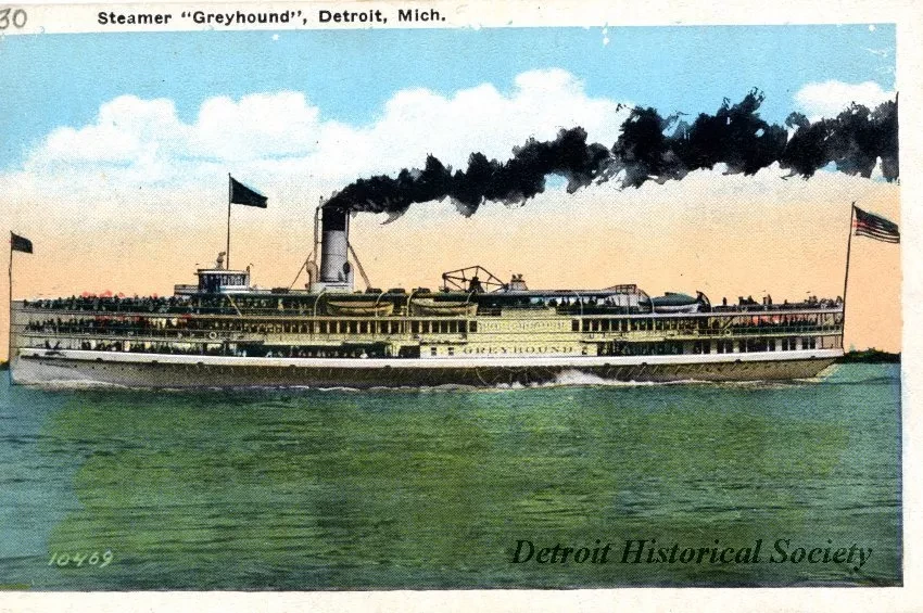 One postcard of the excursion steamship, SS GREYHOUND, of the White Star Line. A colorized photographic image shows a port side view of the sidewheel steamship which is underway in fair weather on a river or lake. Many passengers are standing along the ship decks. A shoreline is visible in the background. Small black printed text along the upper left edge reads "Steamer 'Greyhound,' Detroit, Mich."