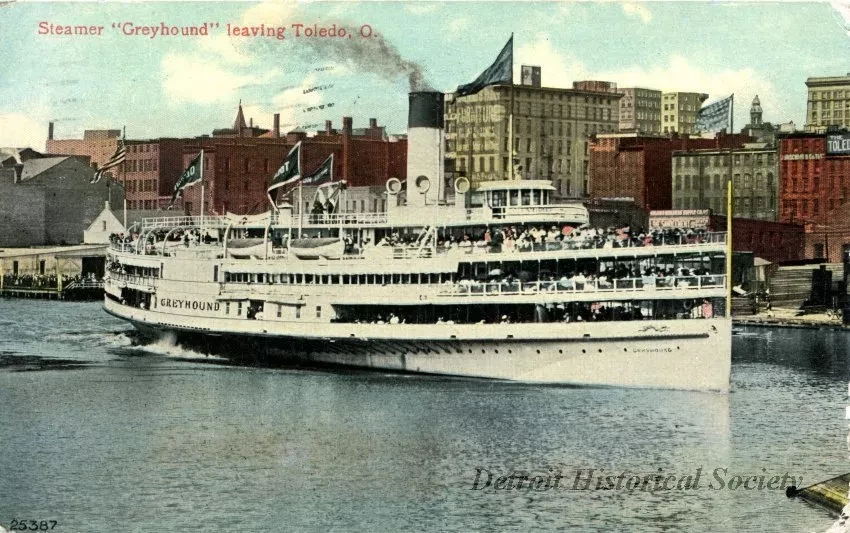 One postcard of the excursion steamship, GREYHOUND, of the White Star Line. The postcard shows a color drawing that depicts a starboard side view of the sidewheel steamship which is underway in fair weather on the Maumee River in Toledo, Ohio. Docks and downtown buildings can be seen in the background. Many passengers are standing on the ship decks. Small red printed text in the upper left corner area reads "Steamer 'Greyhound' leaving Toledo, O."