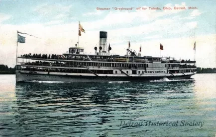 One postcard of the excursion steamship, SS GREYHOUND, of the White Star Line. A colorized photographic image shows a port side view of the sidewheel steamship which is underway on the Detroit River. Many passengers are standing along the ship decks. A shoreline is visible in the background. Small red printed text along the upper right edge reads "Steamer 'Greyhound,' off for Toledo, Ohio, Detroit, Mich." Small printed text on the verso reads "No. C10801, Published by the Detroit News Company, Detroit, Mich.," and "Dresden-Leipzig-Berlin, Made in Germany."