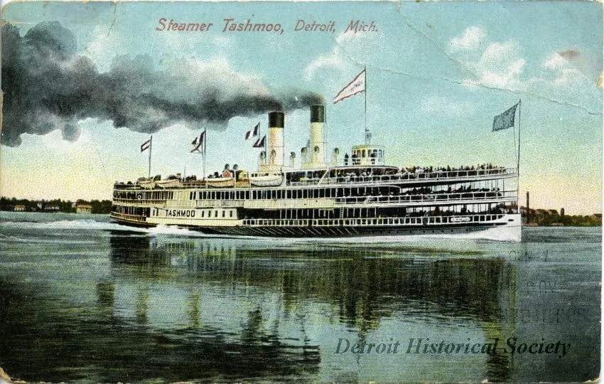 Printed on verso: Steamer Tashmoo. The scene is the picture is typical of a summer day in Detroit along the river front. In the foreground is the fine White Star Line steamer Tashmoo, "Queen of the Detroit River" leading passengers and freight for the famous St. Clair Flats and Port Huron.