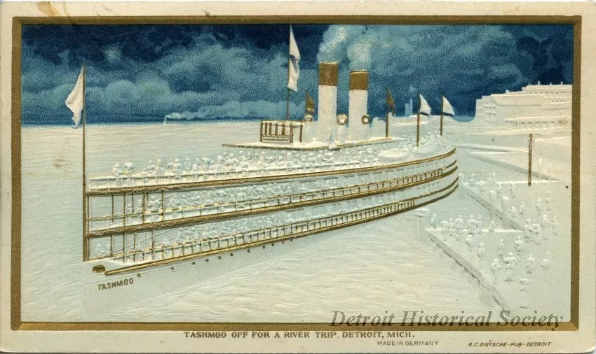 Request ImageColor embossed postcard depicting the TASHMOO docked in Detroit with many people on deck.