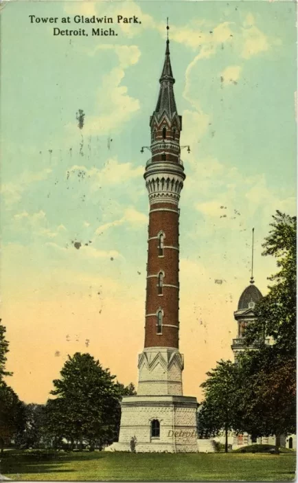 Printed on verso: Tower at Gladwin Park, Detroit, Mich. Located at Gladwin Park consisting of 70 acres of fine floral displays, canals and artificial lakes. Here also is the pumping station with its ponderous machinery which pumps 103,000 gallons of water daily.